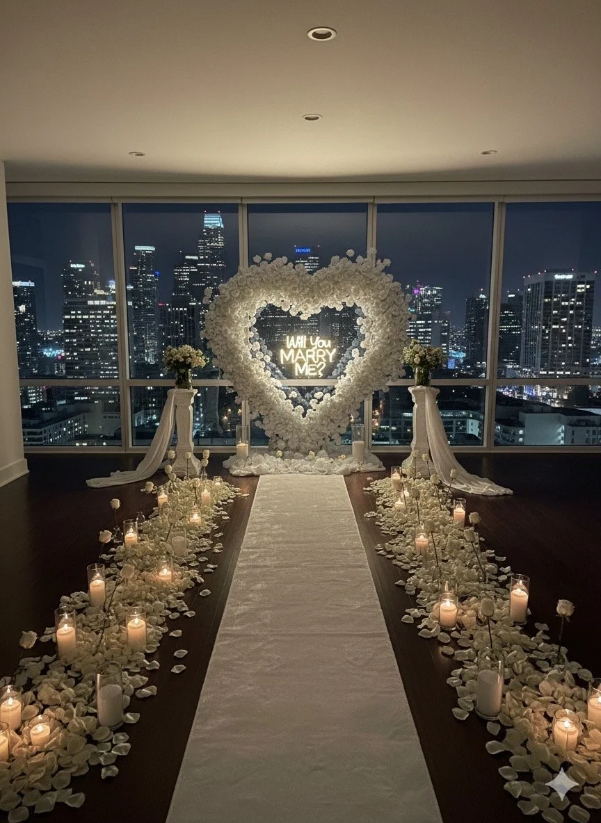 We design luxury, fully customized proposal setups with romantic details that speak directly to your love story — from heart-shaped arches and rose-lined aisles to candlelit backdrops and personalized touches. Every proposal is planned with intention and emotion, creating a scene as unique as the love you share.